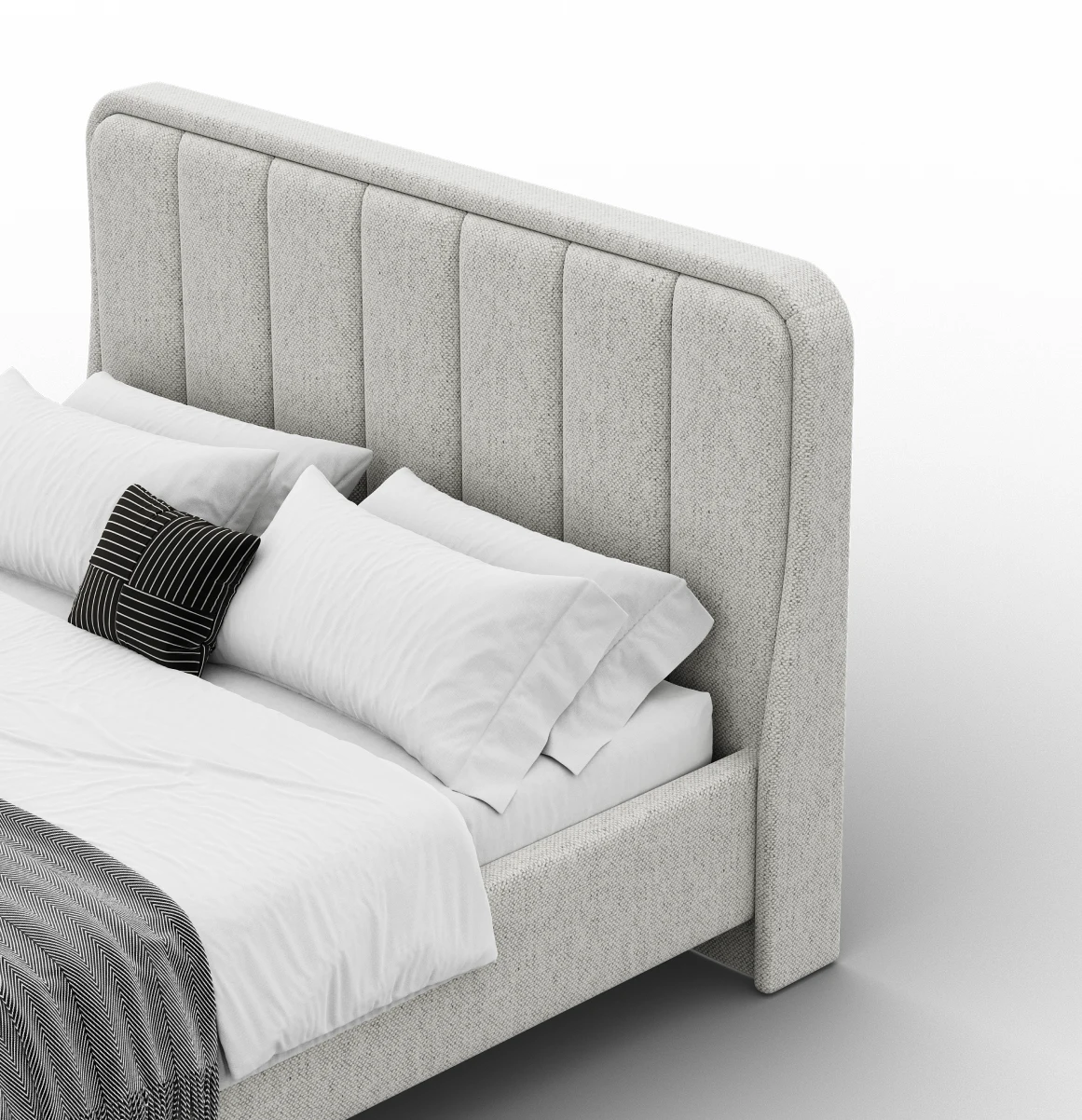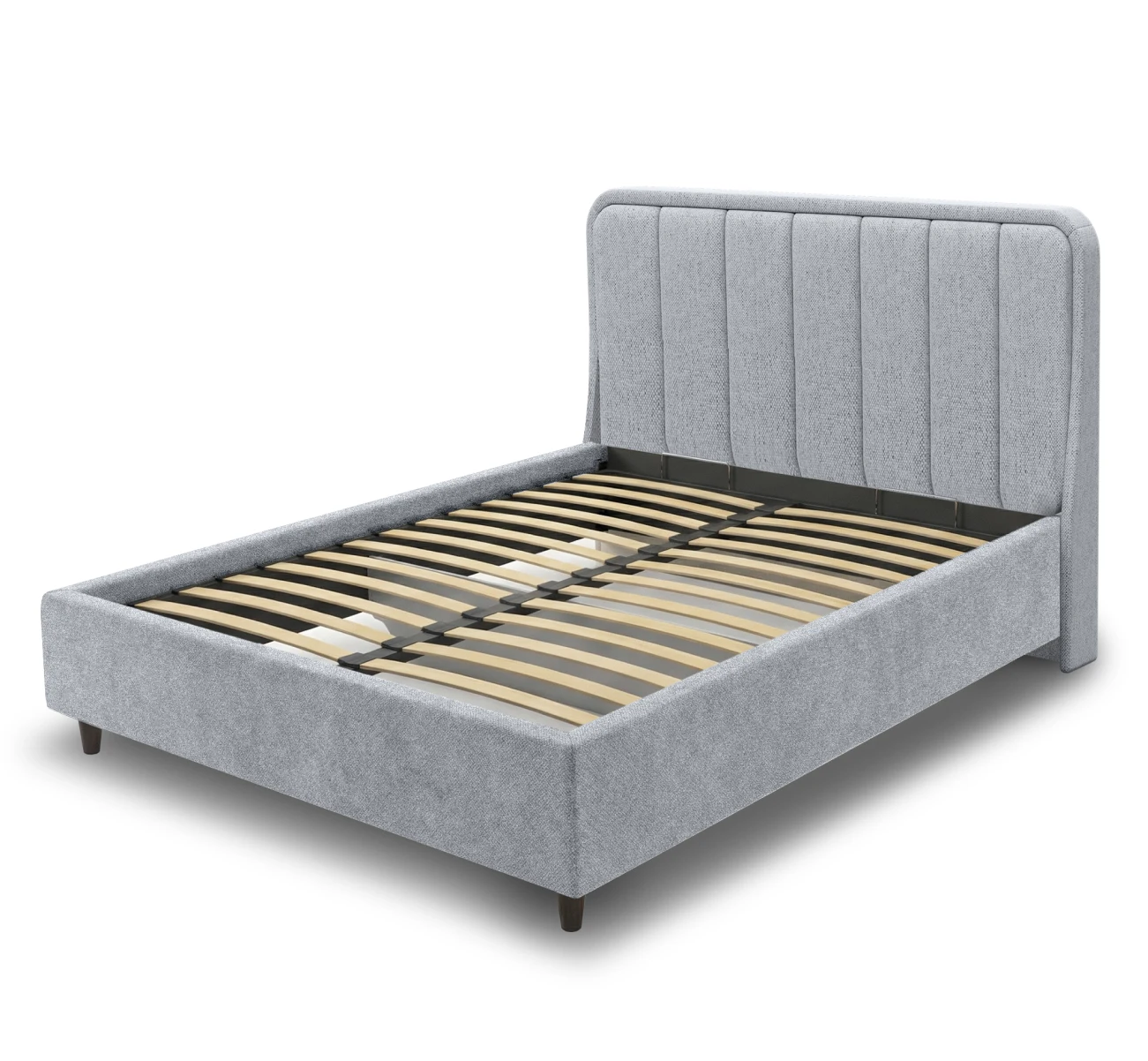 Дизайн изголовья формируется из округлой рамки и отдельных вертикальных вставок, которые изготавливаются и обтягиваются отдельно. Благодаря такому сочетанию все элементы изголовья имеют ярко выраженную выпуклую форму, что придает кровати премиальный внешний вид. Объемные мягкое изголовье